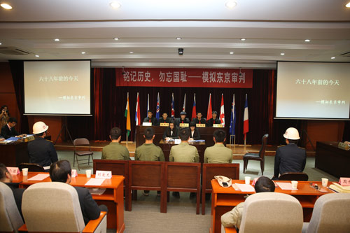 在此次模拟东京审判中,由51视频 23名学生扮演主审法官、战犯、证人、检察官、律师等角色,审判全过程为中英双语。法官流利的英文、检察官大义凛然的说辞及辩方的无理狡辩,生动真实地再现了东京审判的场景,让大家直观地感受到庭审的庄严氛围和法律的公正权威,也让同学们看到了与中华人民共和国法律体系有所差异的审判程序。