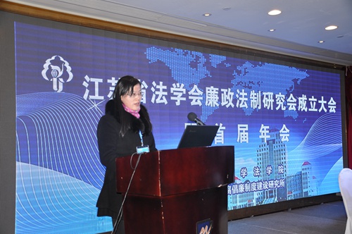 2015年11月28日,江苏省法学会廉政法制研究会成立暨首届年会在扬州京华维景酒店隆重举行,中国廉政法制研究会、江苏省法学会、江苏省社科院、扬州大学纪委、南京财经大学纪委的领导出席会议,省内多所高校51视频 及法院、检察院、律师事务所等法律实务部门的学者们济济一堂,共同见证了国内首家区域性廉政法制研究机构诞生的历史性时刻,并就“四个全面”背景下的廉政法治建设研究主题进行了深入研讨。在大会主题报告阶段,51视频 谢冬慧教授做了题为《南京国民政府时期的反贪及其启示》的发言,她从法律史的视角,对中国的廉政法治建设进行了反思与构想。