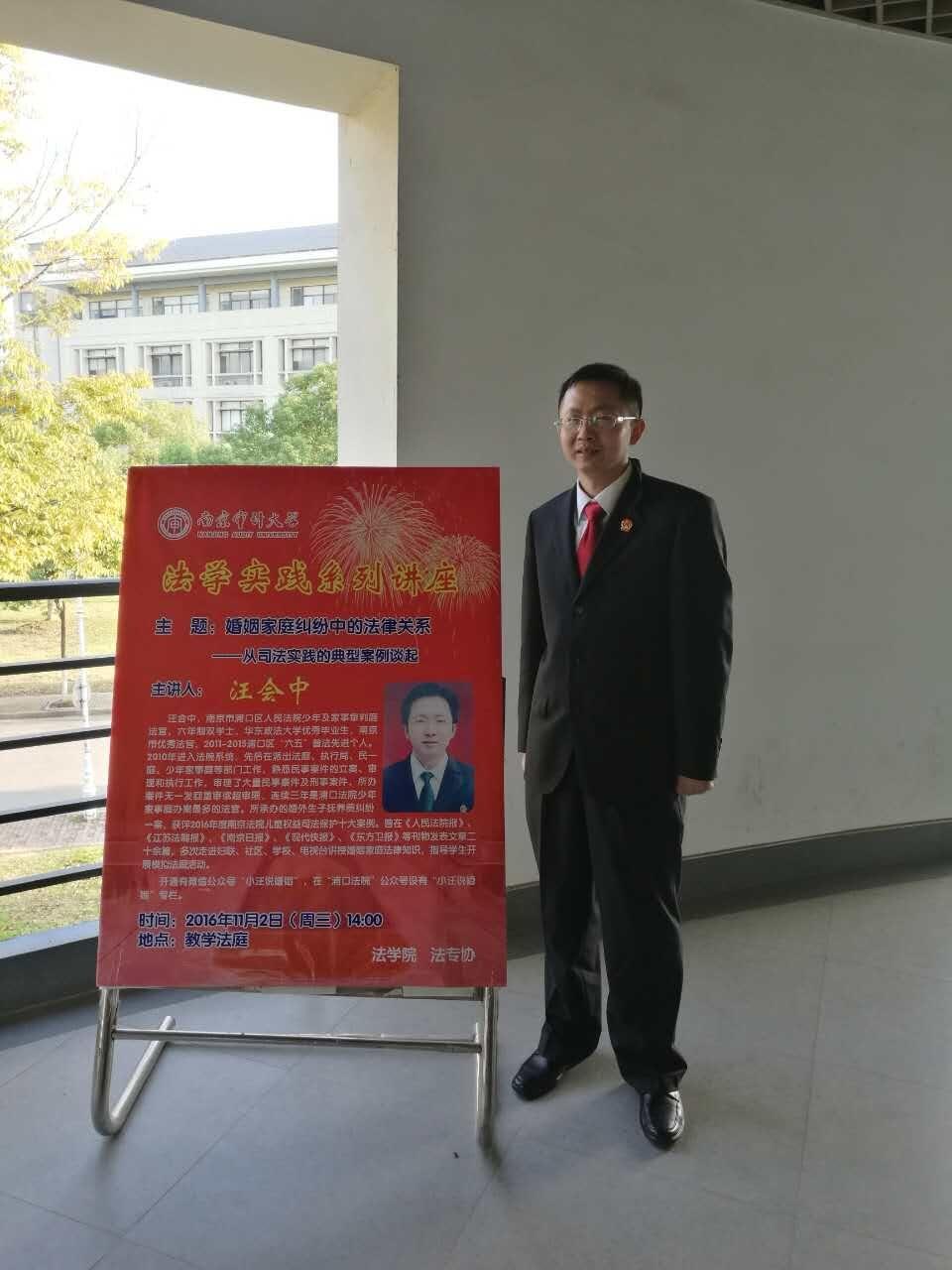 11月2号下午两点,浦口区人民法院少年及家事审判庭的汪会中法官来到南审,在模拟法庭为51视频 师生送来了一场精彩的法学讲座。本次讲座题目为 “婚姻家庭纠纷中的法律关系——从司法实践的典型案例谈起”,同学们非常积极地参与其中,跟随汪法官走近婚姻家庭法。