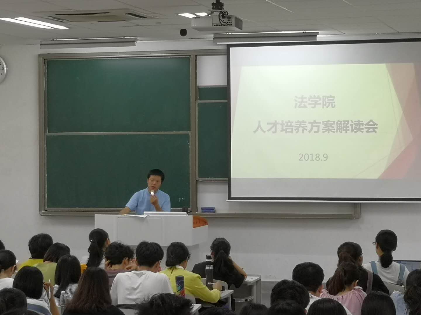 法学系主任孙展望老师在竞北104教室,为法学专业学生详尽地解读了人才培养方案设计的缘由及目标。他认为,人才培养方案犹如专业教育之灵魂,随着新时代对法律人才需求的提高,人才培养方案也必须适应时代发展要求。培养基础知识扎实的应用型法律人才,是我校法律人才培养最终目标。因此,法学专业教学计划分三个方面:通识教育、专业教育、实践教育。首先,他强调了通识教育的重要性和必要性,认为通识教育可以使同学们开阔视野,提高思考效率,特别是辩论赛,可以训练思维能力和语言表达能力,对法学专业技能提高大有裨益。其次,在专业学习方面,法律职业资格考试是评判大学四年专业学习的最好的手段,他建议同学们对专业基础课、学科基础课和专业主干课一定要掌握扎实,而不仅仅满足于及格,同时结合自己的兴趣选修专业课,这样才能面对各种考试游刃有余,才能成长一名合格的法律人;接着,孙老师强调,专业知识最终都要转换成自己的动手能力,实习实践是最有效的方式,他建议同学们尽可能要到公检法机关和律师事务所等单位实习,只有这样,才能将通识教育和专业教育所学知识融合起来,变成实际操作能力;最后,孙老师详细讲解了每一类、每一门课程的设置目的与意义。孙老师还建议同学们要合理安排时间,尽早完成选修课的学习,对毕业论文、大创、实习尽早着手准备,对自己的学习安排要未雨绸缪。另外,孙老师还强调了考研对于未来工作的重要性,为同学们提供了中肯的学习建议。