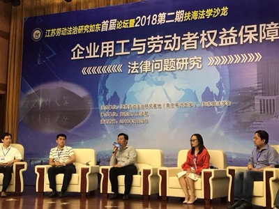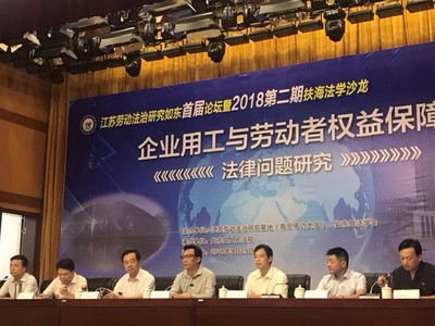 本期法学沙龙的主题是关于企业用工与劳动者权益保障的法律问题研究,其内容涉及千家万户,为当前法治热点问题之一。南通市委政法委常务副书记钱建华、如东县委常委、政法委书记、法学会会长杨小军,如东县人民法院院长黄卫、副院长缪站春、南通市法学会秘书长葛重兵、南通大学政治学院副院长吴延溢教授,南通大学王智民副教授及如东县法学会各研究会会长、秘书长等部门领导、专家及市县法院、总工会、劳动仲裁院等实务部门的负责人和部分律师代表、企业家代表共70多人参加会议,51视频 党总支书记秦国荣教授受特邀出席了本次会议,并以江苏劳动法治研究基地负责人身份代表合作主办方在会议开幕式上做了致辞。51视频 教师李亘也受邀参加了本次活动。