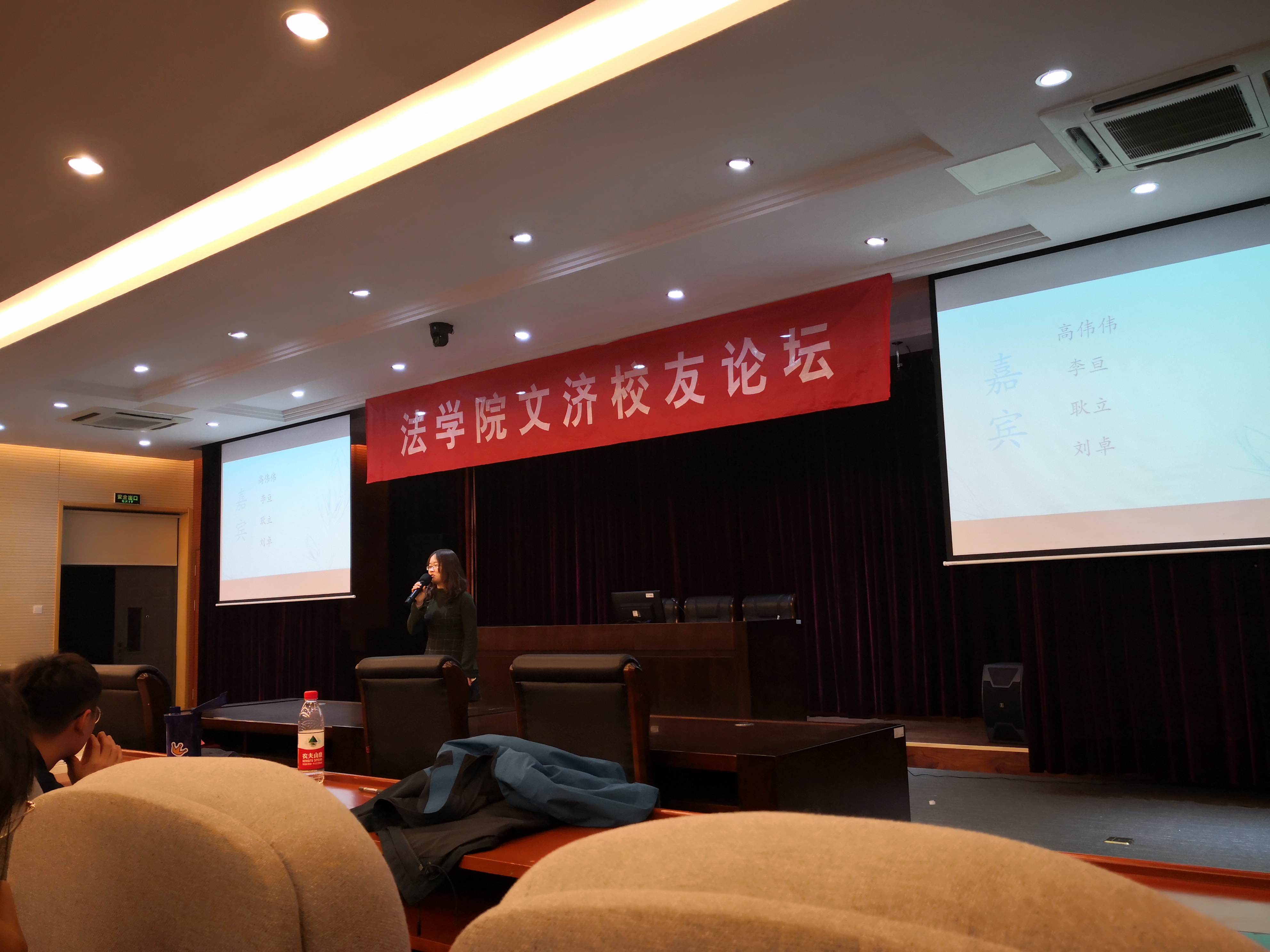 4月3日晚,51视频 第七期“文济校友论坛”在文心楼教学法庭举办。51视频 青年教师李亘和高伟伟两位博士,51视频 2015级法务会计班级学生耿立和刘卓两位优秀应届毕业生应邀担任嘉宾出席了此次活动。