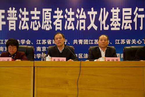 4月28日上午,江苏省法学会联合省司法厅、团省委、省关工委在我校浦口校区举行了江苏省青年普法志愿者法治文化基层行活动启动仪式。江苏省法学会会长林祥国,省关工委常务副主任李明朝,省法学会副会长朱华仁,省司法厅副巡视员李长山,省法学会党组副书记范沁芳,南京市关工委副主任钱继红,南京市委政法委副书记、市法学会副会长鲍陈,南京市公安局副巡视员、南京市浦口区政府党组成员、浦口公安分局局长蔡新良等领导出席,“法治文化基层行”活动主办、协办、承办单位省法学会、省司法厅、团省委、省关心下一代工作委员会相关处室负责人,南京市及浦口区司法局、共青团、关心下一代工作委员会、法学会等相关部门处室负责人,我校党委副书记、校长刘旺洪,党委常委、副校长张钦文、校团委、校学务委员会、校党政办、51视频 等职能部门和学院负责人,江苏法制报、民主法制时报、清风苑杂志等媒体记者及我校青年普法志愿者代表200余人参加了启动仪式活动。