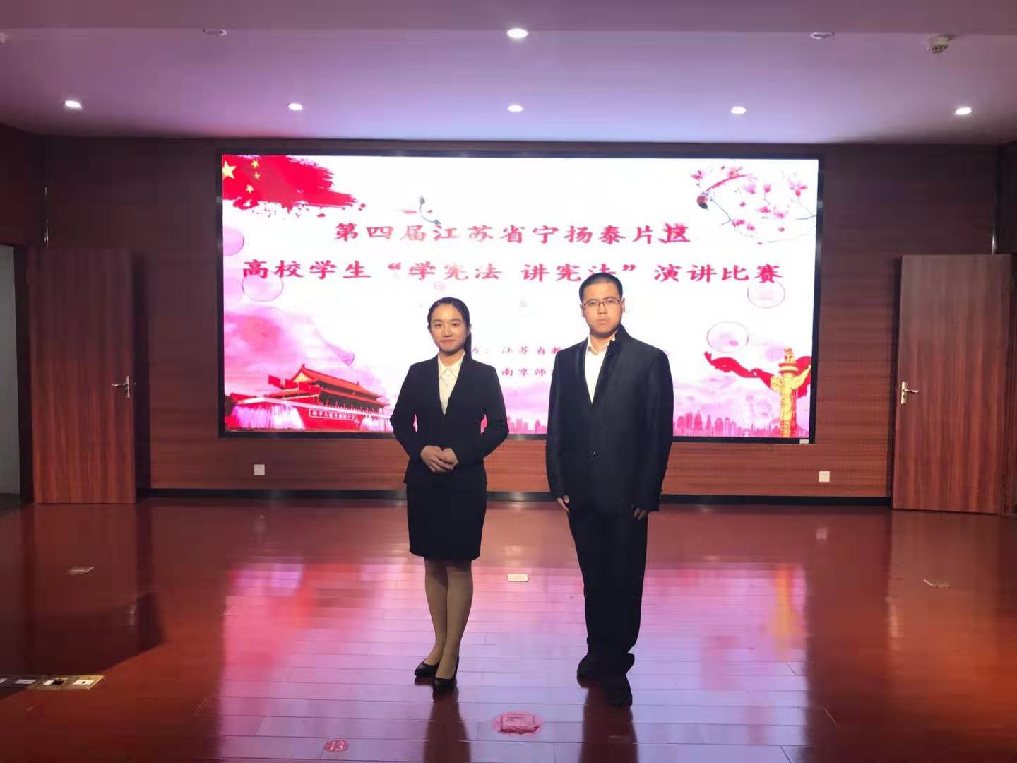 经过前期校内选拔,在法学系主任宪法学博士孙展望老师的指导下,张曹栋、甘璇两位同学代表我校参加了高校片区内比赛。在选拔赛中,张曹栋同学以总分排名第四的好成绩成功晋级省级决赛;甘璇同学则以她与宪法的故事等演讲,展现了南审学子“学宪法讲宪法”的热情。