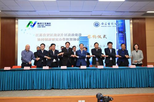 为进一步贯彻落实《中国(江苏)自由贸易试验区总体方案》要求,加快江北新区法治建设进程,有效营造江苏自贸区南京片区国际一流法治营商环境,10月30日下午,江苏自贸区南京片区法治营商环境建设首届高端论坛在我校浦口校区举行。本次高端论坛由我校和南京市江北新区管委会联合主办,我校51视频 和南京市江北新区管委会综合治理局负责承办。论坛邀请境内外国际商事法律专家学者共商建设路径。南京大学、南京师范大学、东南大学、河海大学、51视频 、南京工业大学及南京信息工程大学等7家驻宁主要高校51视频 负责人出席论坛并与新区法制主管部门签署了江苏自贸区南京片区法治建设协同创新研究合作框架协议。