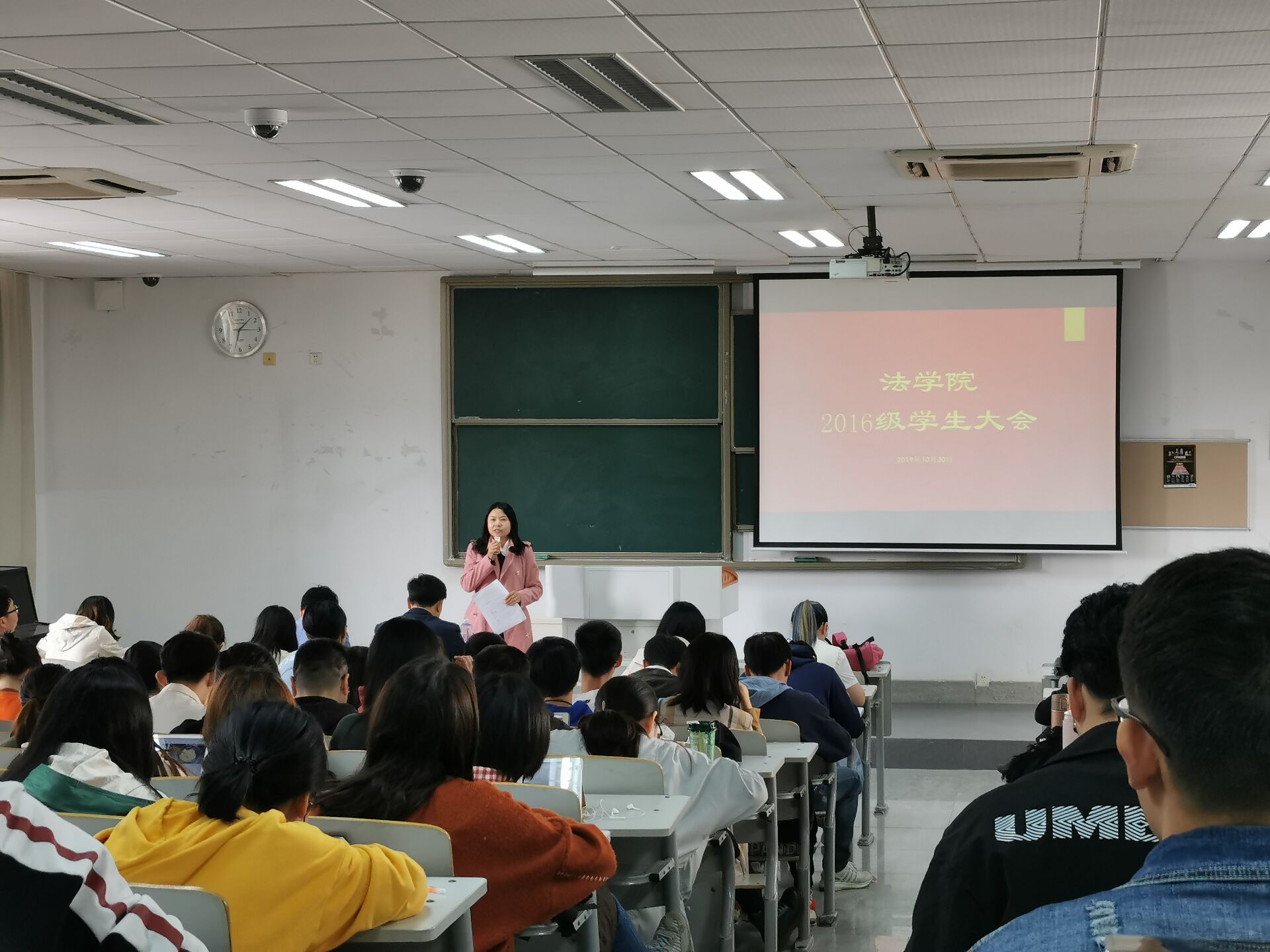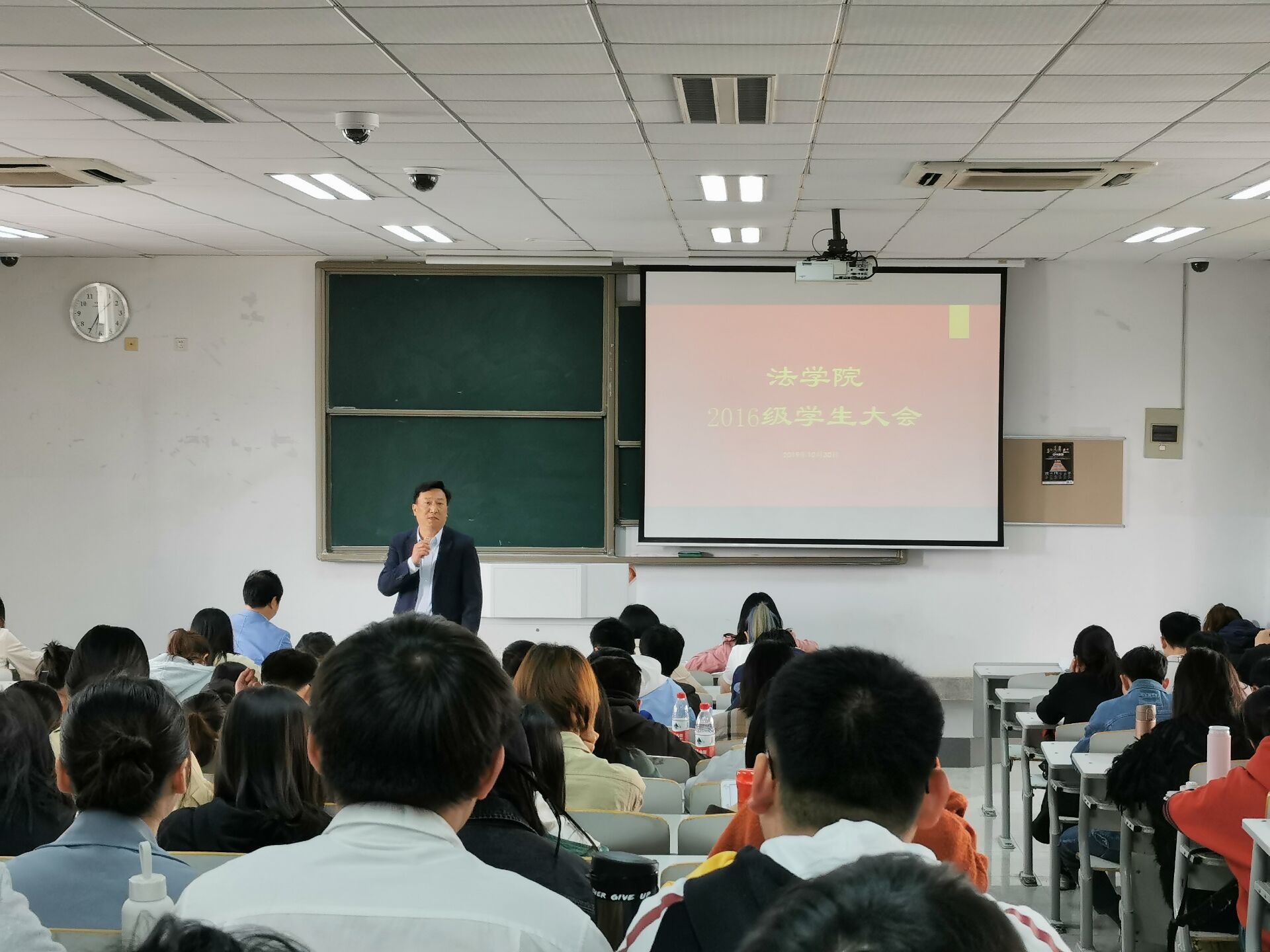 首先,秦国荣书记针对16级学生就业、考研、公考等方面做了动员讲话。他指出,考研重在坚持,不可因外在条件所干扰,同时要结合自已的实际情况进行选择目标学校,脚踏实地认真复习。他同时介绍了51视频 往年考研的报名情况,为同学们提供了参考。对于就业与公考,秦书记特别提醒同学们注意鉴别工作信息的真假,对自己抱有信心,勇于尝试;公考时量力而行,切忌好高骛远。他还介绍了51视频 的实习基地情况,指出法学专业拥有一批优质的实习基地,鼓励同学们积极报名到实习基地进行毕业实习。