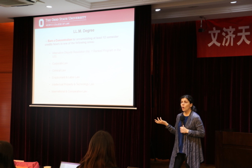 随后,俄亥俄州立大学一行在教学法庭与51视频 同学们进行了交流。Laura Fernandez院长详细介绍了该大学的规模、师资力量、综合排名和专业设置等内容,还重点介绍了2020年7月份的美国法律与实践基础暑期项目,鼓励有志于海外深造的学生积极申报。对方还对申报条件、文书写作等方面作了详细解释,并表示对南审学子提供研究生项目学费六折的优惠,大力减轻求学负担。会上,学生踊跃提问,Laura Fernandez院长和孙依老师为同学们耐心答疑解惑,进行了友好交流。