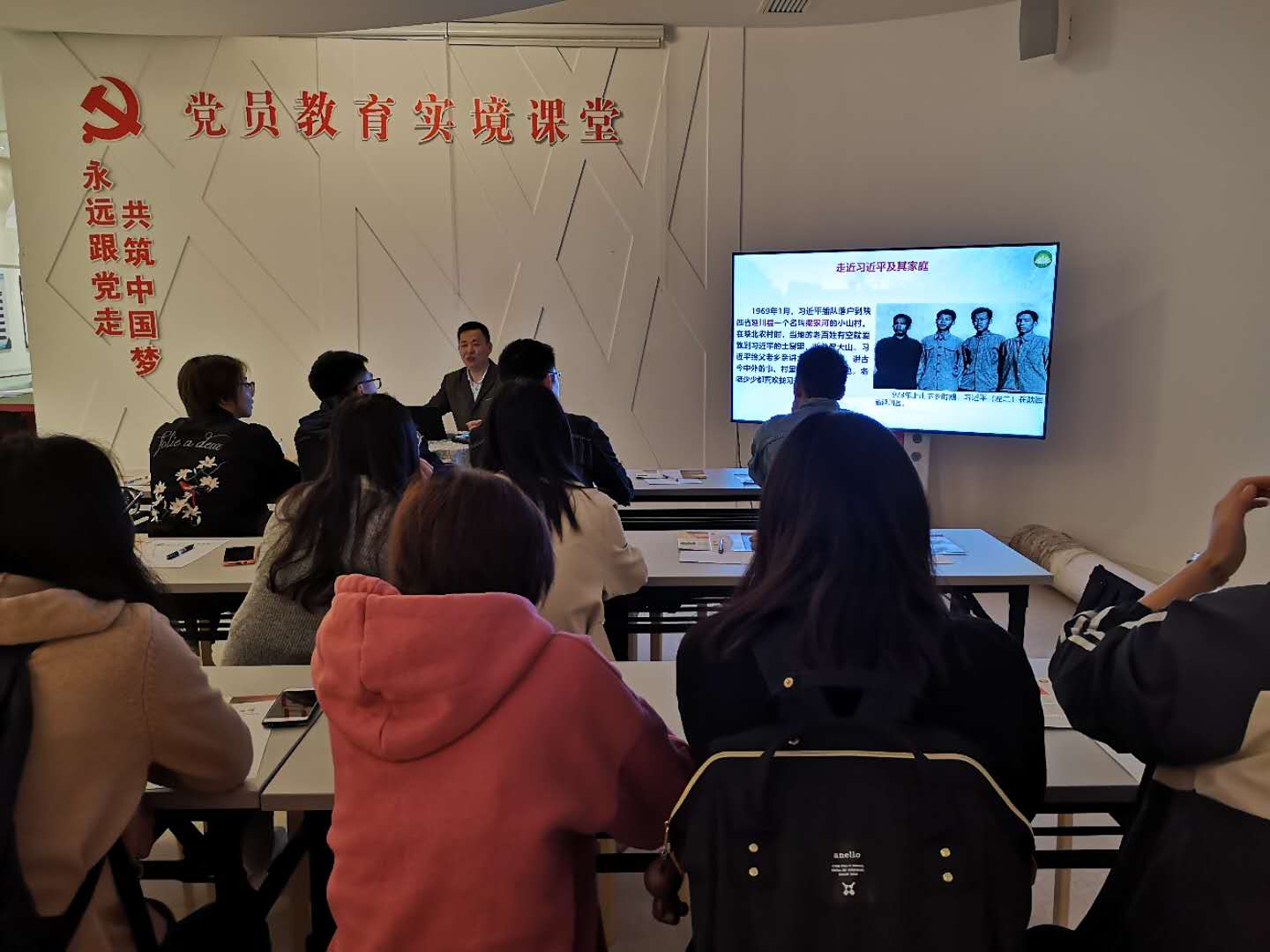 第二个部分,参加微党课学习。马克思主义学院的丁老师为同学们开启了一次别具特色的习近平谈治国理政(第三卷)的学习。课上,老师带领同学们回顾习近平总书记早年经历,尤其是梁家河篇,谈到送别的场景感人颇深。那里我们看到了一个少年成长的足迹,一位总书记年少时的初心。丁老师循序渐进,从三个方面:以人民为中心、提升党的领导力和加强党的领导展开学习,期间同学们积极发言,收获颇丰。党课教育圆满结束。