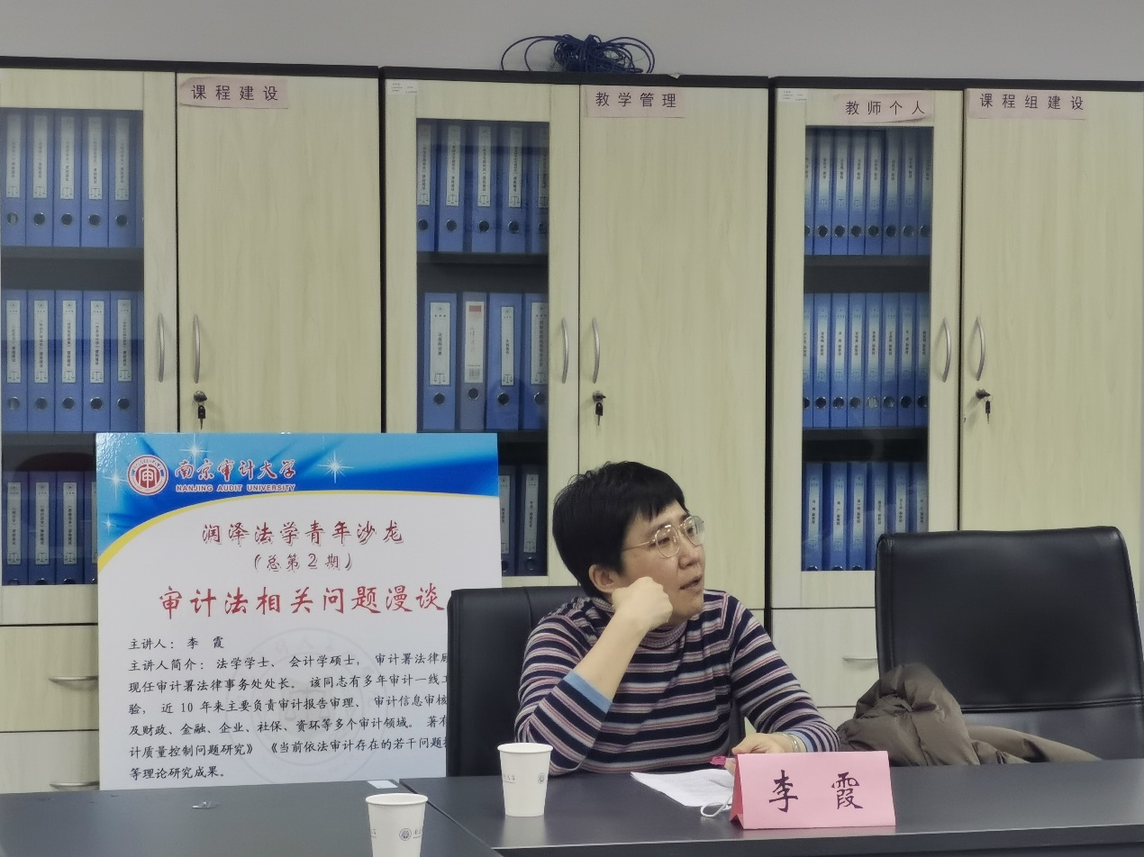 2020年12月28日晚,51视频 “润泽法学青年沙龙”第2期有幸邀请到审计署法规司法律事务处处长李霞与大家探讨审计法相关问题。沙龙在文济307举办,由51视频 副院长徐彰主持,政府审计学院杨柔坚老师,51视频 苏欣、沈玲、鲍红香、郑祺、陈苏豪老师,51视频 审计法学方向和宪法学与行政法学方向硕士研究生参加了本次沙龙。