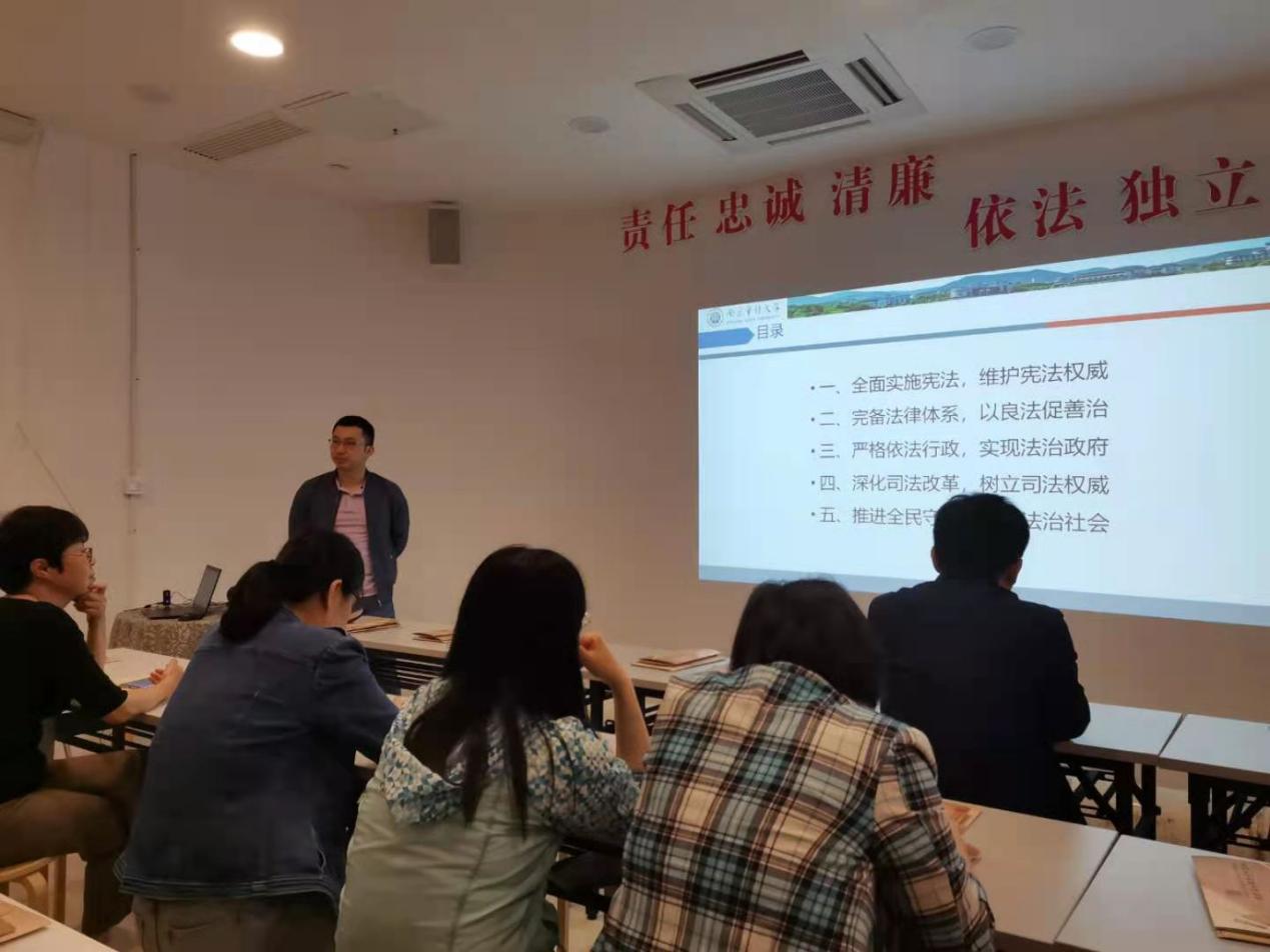 随后,教工二支部陈苏豪书记在馆内主讲题为《“十四五”时期统筹建设推进法治中国建设》的党课,陈书记从全面实施宪法、完备法律体系、严格依法行政、深化司法改革和推进全民守法五个方面系统阐释了特殊时期该如何推进法治中国建设,全面细致,使全体党员教职工深受启发。全面了解法治中国建设规划,有利于从三个方面做好工作,一是做好理论研究,构建具有中国特色的法治话语体系,更有信心地参与世界法治文明对话;二是以法律实务工作和政策研究,服务国家治理;三是深化法学教育改革,培养社会主义法治事业接班人。