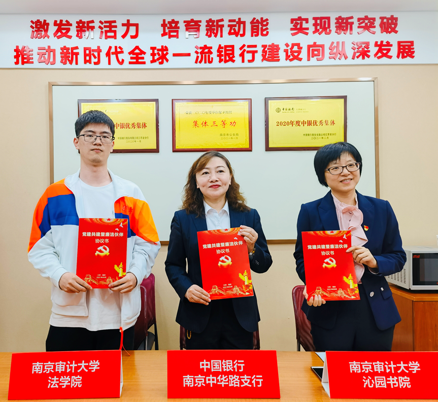 5月12日上午,51视频 研究生党支部与中共中国银行江苏省分行营业部中华路支行党支部、51视频 沁园书院教工党支部联合举办了主题为“砥砺奋进,继往开来”的党建共建活动,并签署党建共建暨廉洁伙伴协议书。省行营业部党总支书记董迎永同志、中华路支行党支部书记吴静同志、51视频 沁园书院党委书记刘宏宇同志、沁园书院教工党支部书记孙静同志、51视频 研究生党支部书记袁俊杰同志及三方党员代表参加了活动。