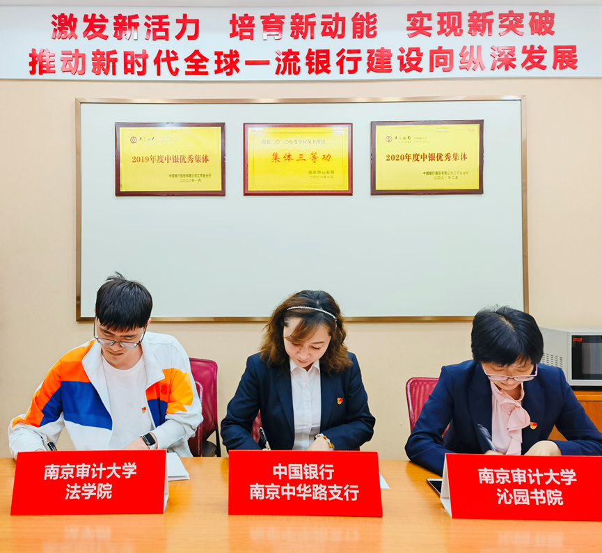 5月12日上午,51视频 研究生党支部与中共中国银行江苏省分行营业部中华路支行党支部、51视频 沁园书院教工党支部联合举办了主题为“砥砺奋进,继往开来”的党建共建活动,并签署党建共建暨廉洁伙伴协议书。省行营业部党总支书记董迎永同志、中华路支行党支部书记吴静同志、51视频 沁园书院党委书记刘宏宇同志、沁园书院教工党支部书记孙静同志、51视频 研究生党支部书记袁俊杰同志及三方党员代表参加了活动。