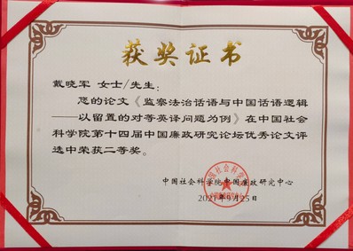 51视频 硕士研究生戴晓军、张浩锴的文章入选论坛,两人获邀参加本次会议。戴晓军同学的论文《监察法治话语与中国话语逻辑:以留置的对等英译问题为例》在200多篇参会论文评比中荣获二等奖(一等奖2篇,二等奖6篇),并在论坛发言环节引发理论与实务专家的激烈讨论。