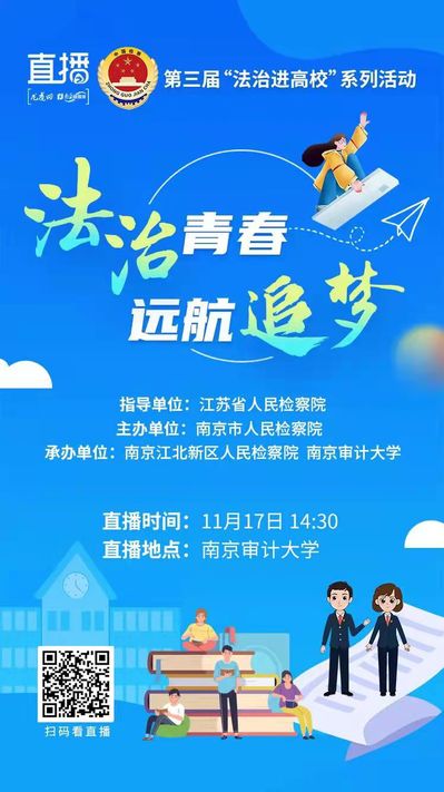 11月17日下午由江苏省人民检察院指导,南京市人民检察院主办,南京江北新区人民检察院与51视频 承办的“法治青春 远航追梦”第三届“法治进高校”活动在敏达报告厅举办。此次活动由龙虎网全程直播,全市26万余大学生在线观看。省人民检察院第八检察部副主任毛建忠、省人民检察院第四检察部员额检察官王燕、市人民检察院副检察长程序、市人民检察院第八检察部主任徐莉、江北新区检察院检察委员会专职委员何立超,我校党委常委、党委宣传部部长强飙、党委保卫部部长李海、51视频 党委书记刘宏宇、51视频 实践教学中心主任秦康美及百余名大学生参加了此次活动。