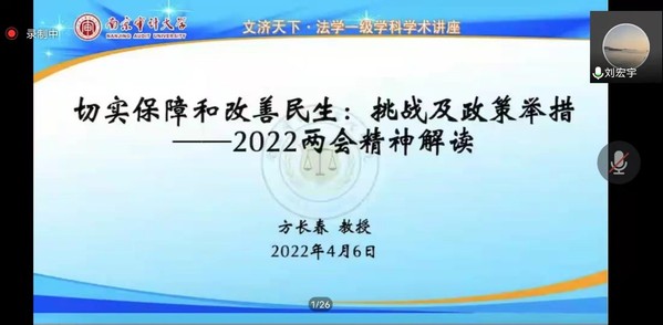 4月6日晚,51视频 邀请南京大学社会学院方长春教授,作《切实保障和改善民生:挑战及政策举措——2022两会精神解读》专题讲座。本次讲座根据新冠防疫要求采用线上方式进行,来自党委组织部、润园书院、51视频 的近300名党员师生聆听了报告。讲座由51视频 党委书记刘宏宇主持。