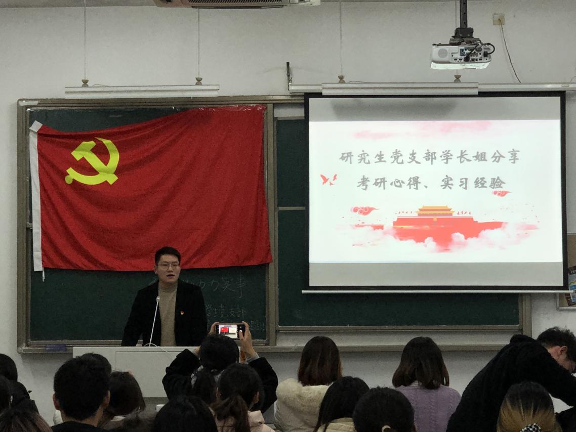 随后,研究生党支部的冀硕同志向大家分享了自己的考研心得、实习经验。冀硕同志结合自身的择校、初试、复试经验,分别从院校选择、时间安排、考研调剂、是否报名机构、法考与考研是否同时准备、初试后何时与导师联系等角度向大家进行了全面的分析,为其他同志们如何规划接下来的学习提供了重要参考。