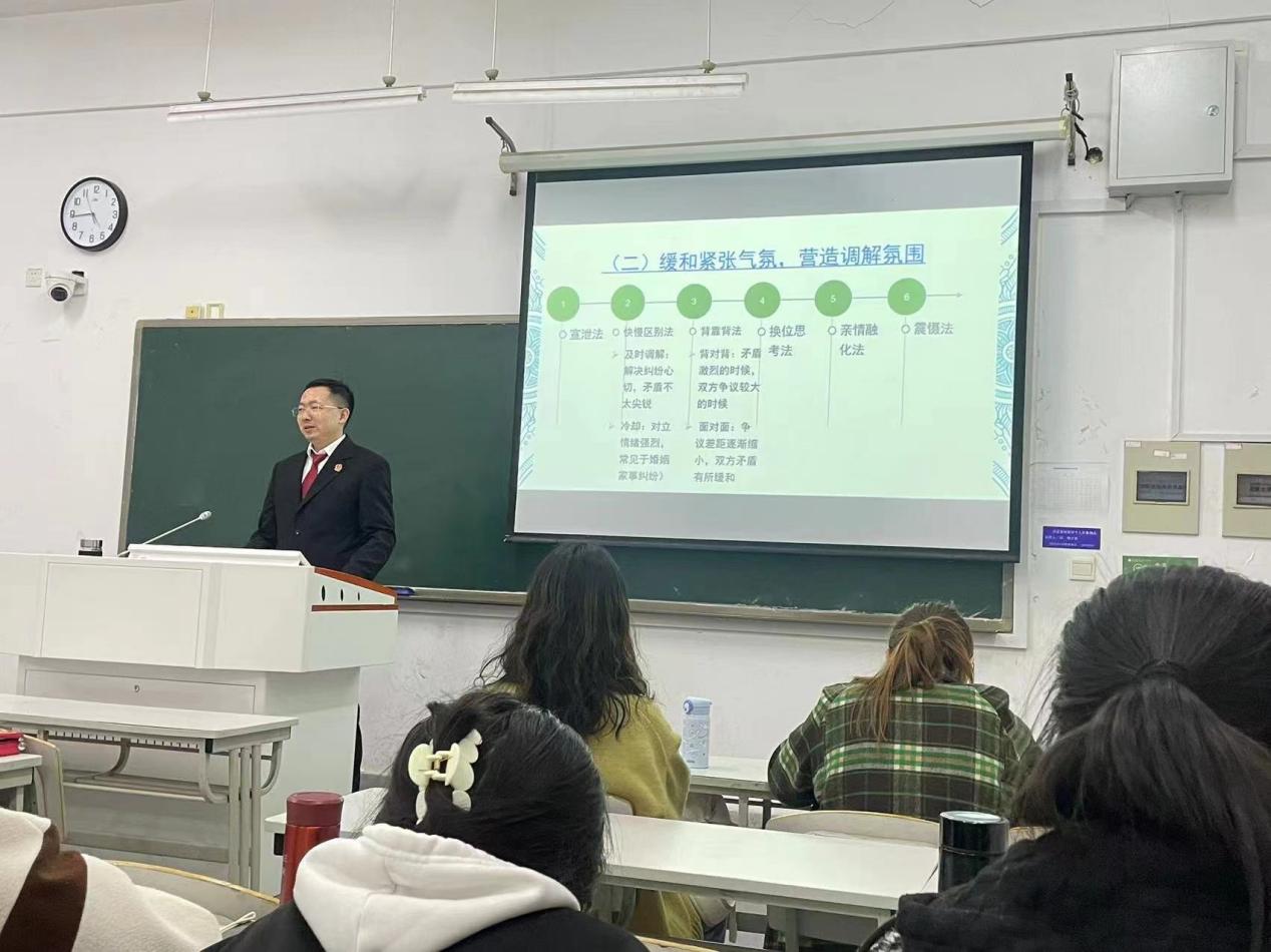 接着,汪法官向同学们讲解了民事调解的概念、流程、原则等理论知识,同时通过真实案例对民事调解的非对抗性、尊重民俗等调解技能进行详细讲解,生动形象地向学生们传递了民事调解的重要性和相关技巧。在对民事调解的知识、技能进行讲解和示范后,汪法官还组织了模拟调解实践活动,让学生们分成五组,进行关于民事调解的实战演习。通过演习,学生们沉浸式体验了民事调解的流程和调解中不同当事人的表现,充分感受到民事调解的良好效果。