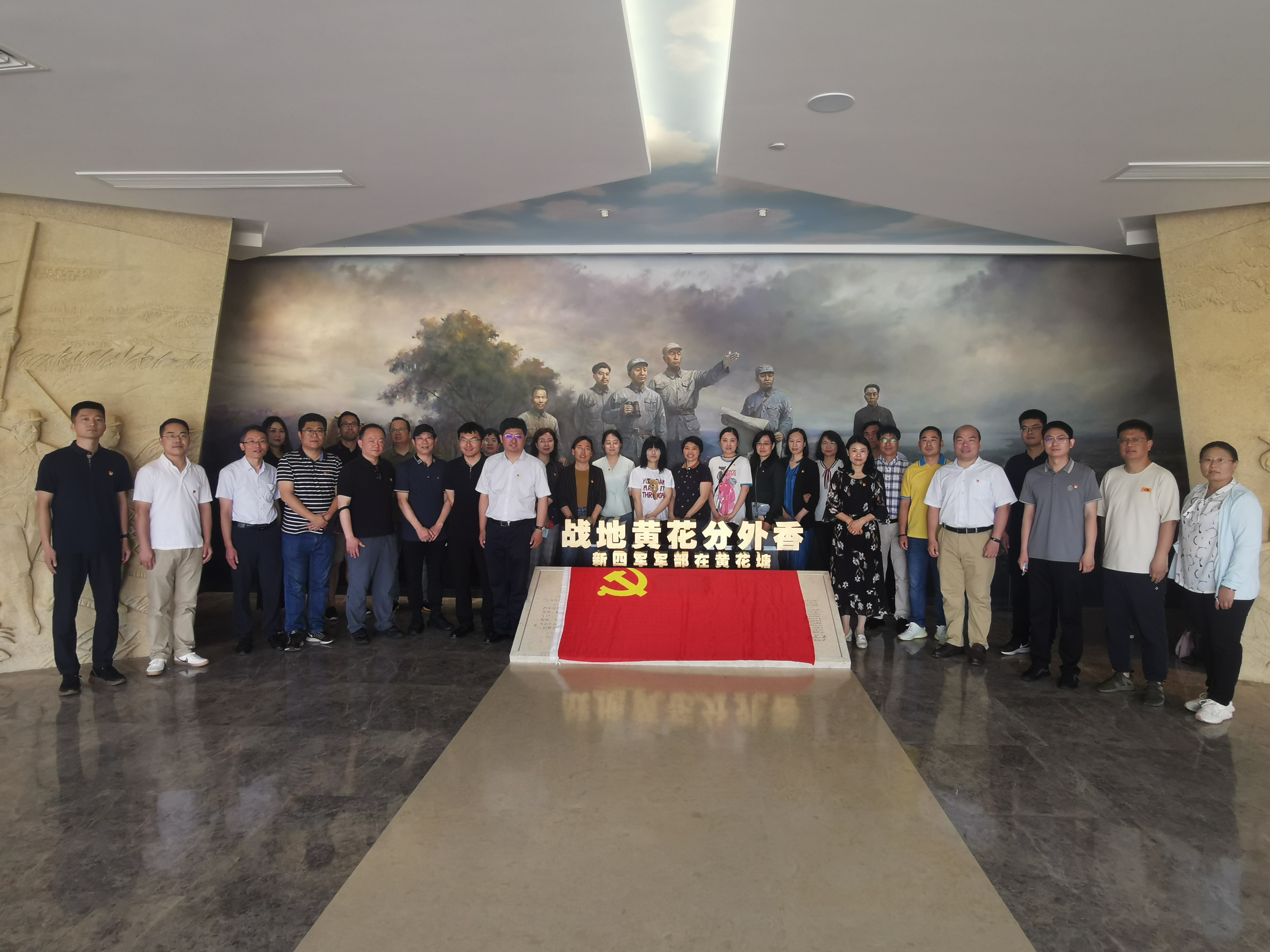 6月3日上午,51视频 党委一行43名教师党员从51视频 浦口校区润泽广场旗杆处集合出发,乘车前往黄花塘新四军军部纪念馆开展主题党日活动。黄花塘原来只是一个默默无闻的小村庄,但它在波澜壮阔的中国革命史上写下了辉煌的篇章。从1943年1月初到1945年2月底,在全国抗日战争由相持阶段转入反攻的关键阶段,新四军军部移驻黄花塘。在此期间,军部在艰苦卓绝的条件下,运筹帷幄,指挥抗日,粉碎了日伪军的"扫荡"、"清乡"和国民党顽固派的磨擦、进攻,在苏、皖、浙、鄂、豫五省开辟了八个敌后抗日根据地,在日军统治的心脏地区插上了一把尖刀,使华中地区成为对敌斗争的主战场。新四军和八路军一起,为夺取抗日战争的全面胜利作出了巨大贡献,也付出了重大牺牲。