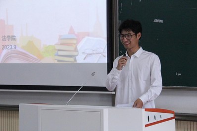 在校生代表2021级法会3班马平阳向新生同学们分享自己学习生活的经验。他告诫同学们要早做规划、提前准备。同时,他提醒同学们一定要注意劳逸结合,学业繁重也不能累坏身体,要循序渐进,一步一个脚印。