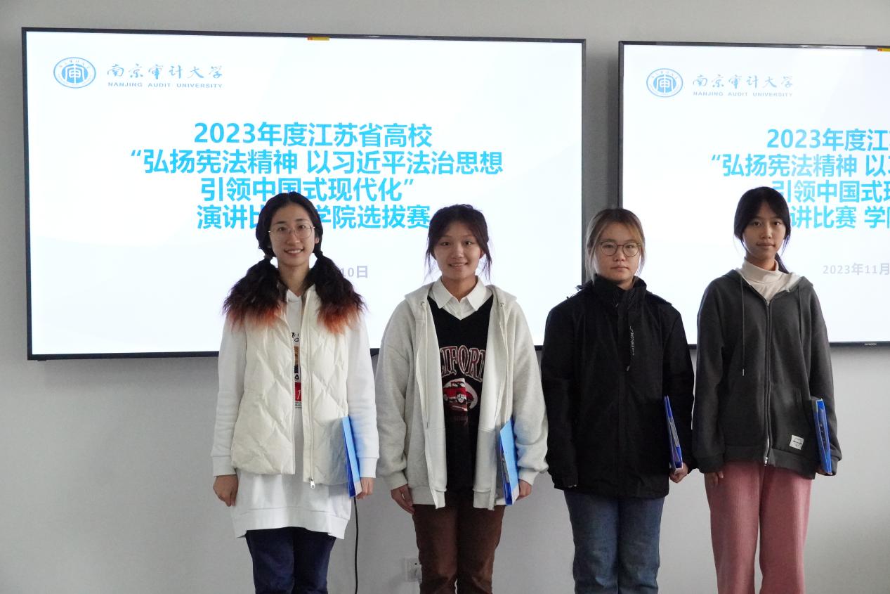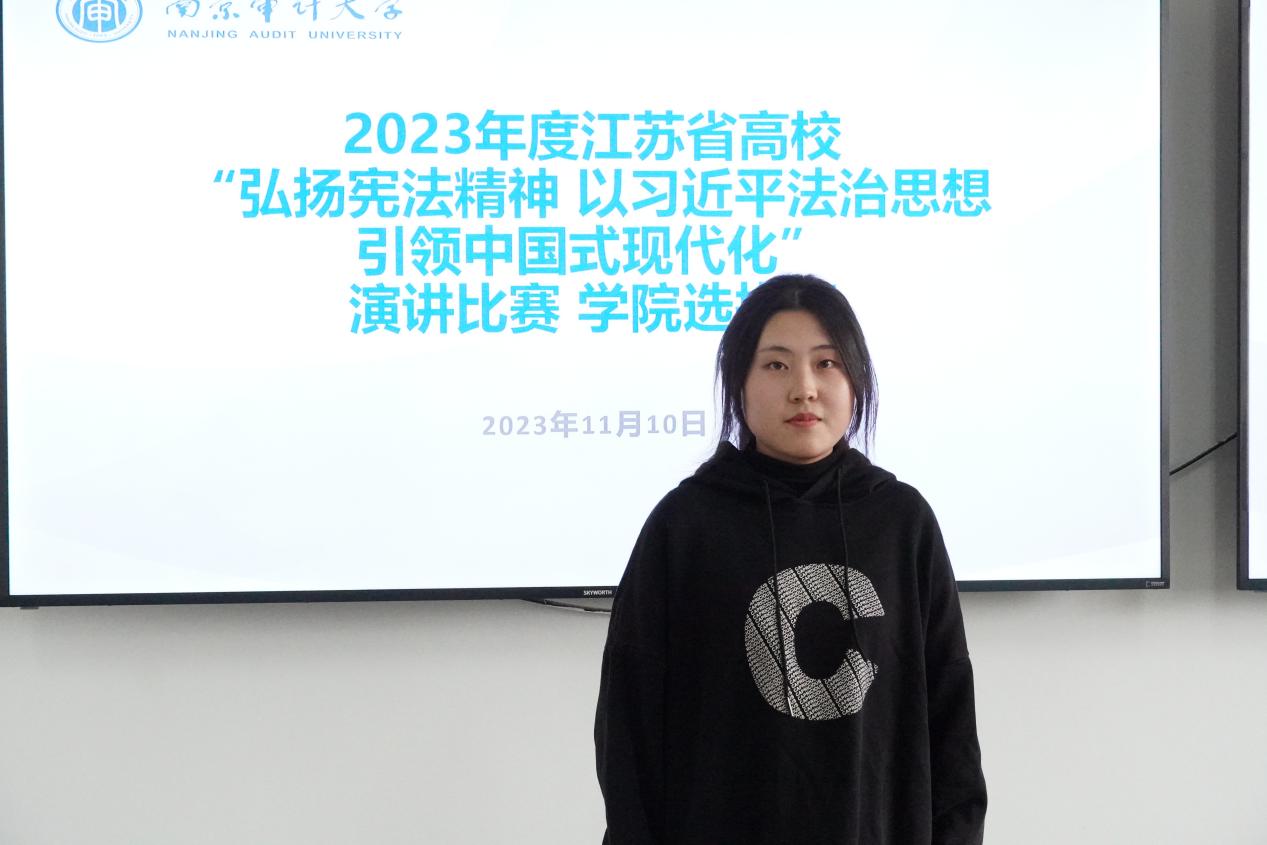 2023年11月10日中午,2023年度江苏省“弘扬宪法精神以习近平法治思想引领中国式现代化”演讲比赛学院选拔赛于文济楼307成功举办。本次比赛包括个人赛与团队赛两个赛道,由施卫忠、秦康美、郝炜三位老师担任评委,共计四名演讲选手和四组演讲团队参与。他们以文字抒写法治情怀,以演说弘扬宪法精神,整场选拔赛精彩纷呈,掌声迭起。