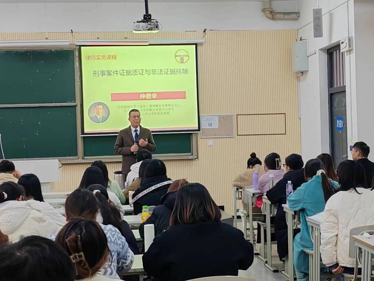2023年11月13日下午,由北京观韬中茂(南京)律师事务所与51视频 联合开设的律师实务系列课程“观韬大讲堂”第二讲在51视频 文济楼301开课。北京观韬中茂(南京)律师事务所高级合伙人仲若辛律师以《刑事案件证据质证与非法证据排除——以云南张满故意杀人案为例》为题,为南审51视频 百余名师生授课。