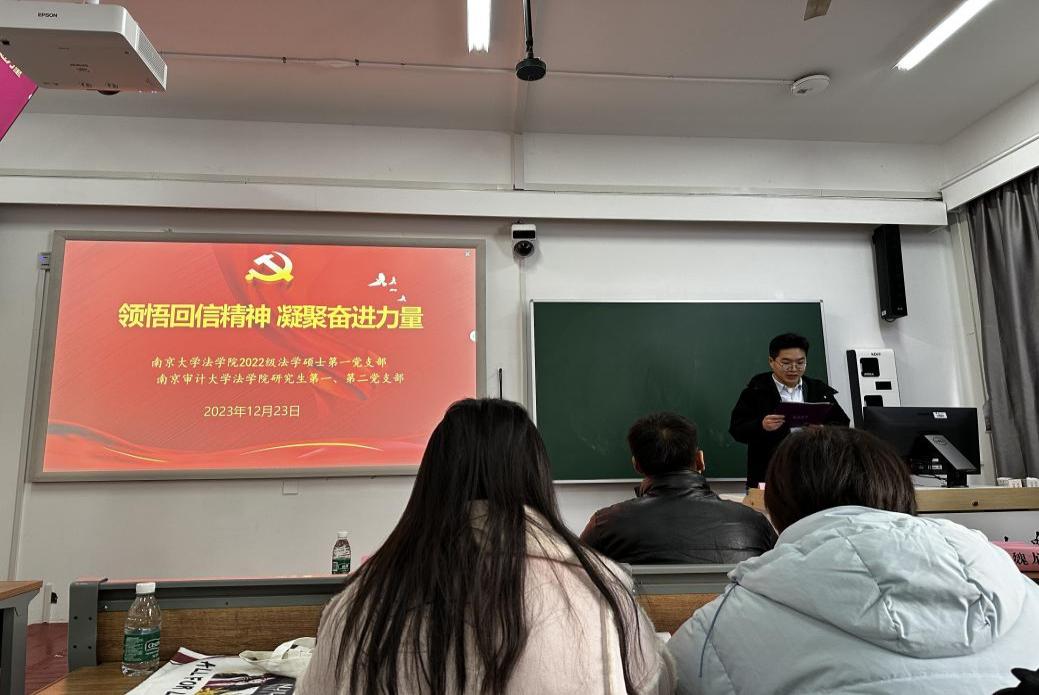 为深入学习习近平总书记给51视频 审计专业硕士国际班留学生的回信精神和南京大学留学归国青年学者的回信精神,以及习近平总书记在中共中央政治局第十次集体学习上的讲话精神,进一步加强研究生党支部建设,12月23日上午,51视频 研究生第一、第二党支部部分党员赴南京大学(浦口校区)参观学习,与南京大学2022级法学硕士第一党支部共建,开展“领悟回信精神,凝聚奋进力量”的主题党日活动。