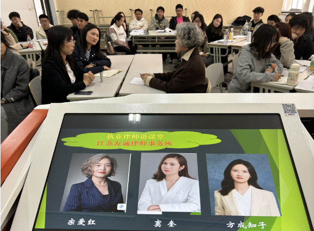 3月19日下午,江苏友诚律师事务所宗爱红主任携婚家继承团队窦奎律师、方成知子走进51视频 24春诊所1班课堂,与胡晓涛老师合作完成法学专业综合实验课程中“律师接待当事人”一讲的课堂教学活动。