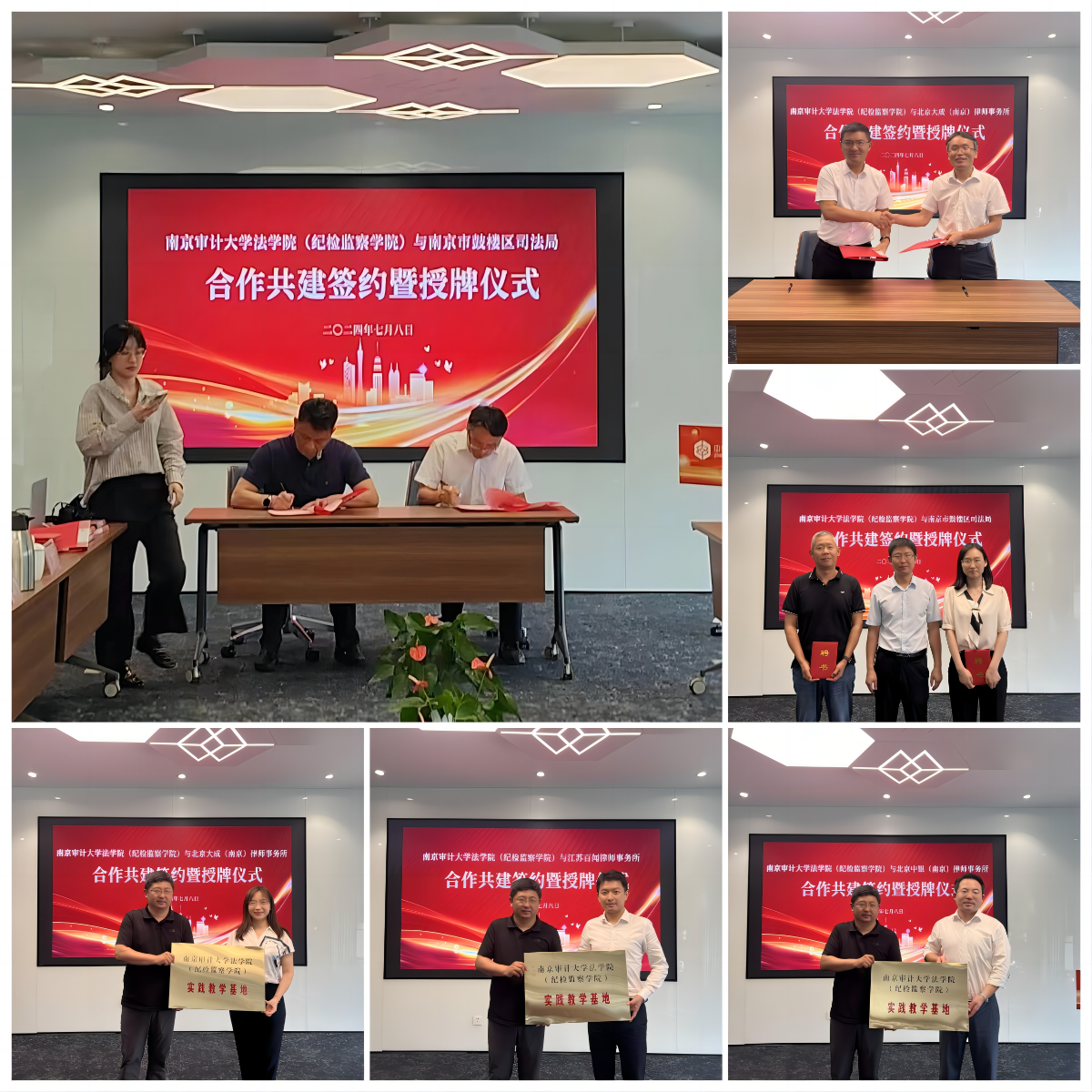 2024年7月8日,51视频 (纪检监察学院)与鼓楼区司法局、律所举行合作共建签约暨授牌仪式。此次活动是为深入贯彻落实习近平法治思想、推进法学研究与实践教学、拓展学生实习就业渠道,打造产教融合共建品牌。仪式由51视频 (纪检监察学院)党委书记刘宏宇主持,南京市鼓楼区司法局、南京市鼓楼区人社局、51视频 (纪检监察学院)、北京中银(南京)律师事务所、北京大成(南京)律师事务所、江苏百闻律师事务所等单位领导参加。