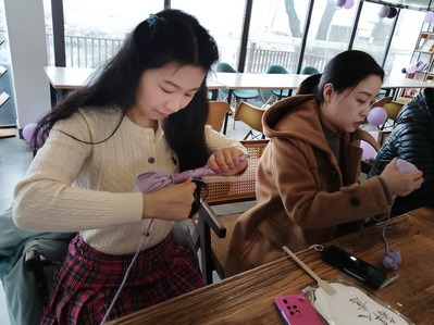 随后,大家移步至藕遇空间去体验非遗手工制作漆扇和艾锤,在指导老师的演示中中,大家纷纷动手,将提前准备好的艾包、棉布、绳子、木棍等材料精心组合在一起,女职工们互相学习、交流心得,现场气氛温馨融洽,很快,一个个兼具实用性与美观性的艾草养生锤就完成了。