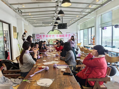 做完艾锤,大家还兴趣盎然的参加击鼓传花和漆扇制作等愉悦身心的活动,大家根据个人喜好调配颜色、制作花纹,每一步都充满了创意与巧思,大家深深沉浸于‘水中作画’的奇妙体验,以“漆”为笔,用“扇”作画,传统工艺与现代审美的交融,让每把漆扇都成为承载女性巧思的艺术品。
