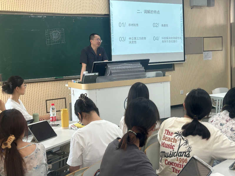 在实践教学环节,汪法官结合婚姻家事与继承纠纷、恋爱纠纷、交通事故、校园安全等大量真实典型案例,细致讲解民商事调解的流程、方法与技巧。他指出,调解需先全面了解案件基本事实,挖掘潜在信息,精准归纳争议焦点;在此基础上,通过心理疏导缓和紧张气氛,探寻当事人心理预期;最后,抓住矛盾焦点,通盘考量各方利益,因势利导,找准利益平衡点,促成调解协议达成。