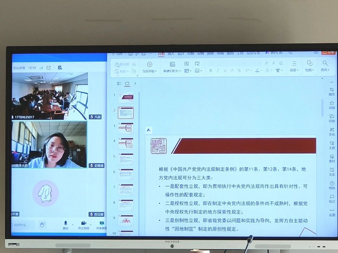 李尧老师介绍本次选题源于浙江省委办公厅法规处委托项目,主要梳理了习近平总书记在浙江工作期间关于党内法规制度建设的论述与实践。她引用中央办公厅法规局的数据表明,地方党内法规占现行有效党内法规总量的88.7%,是党内法规体系中最具活力的组成部分。